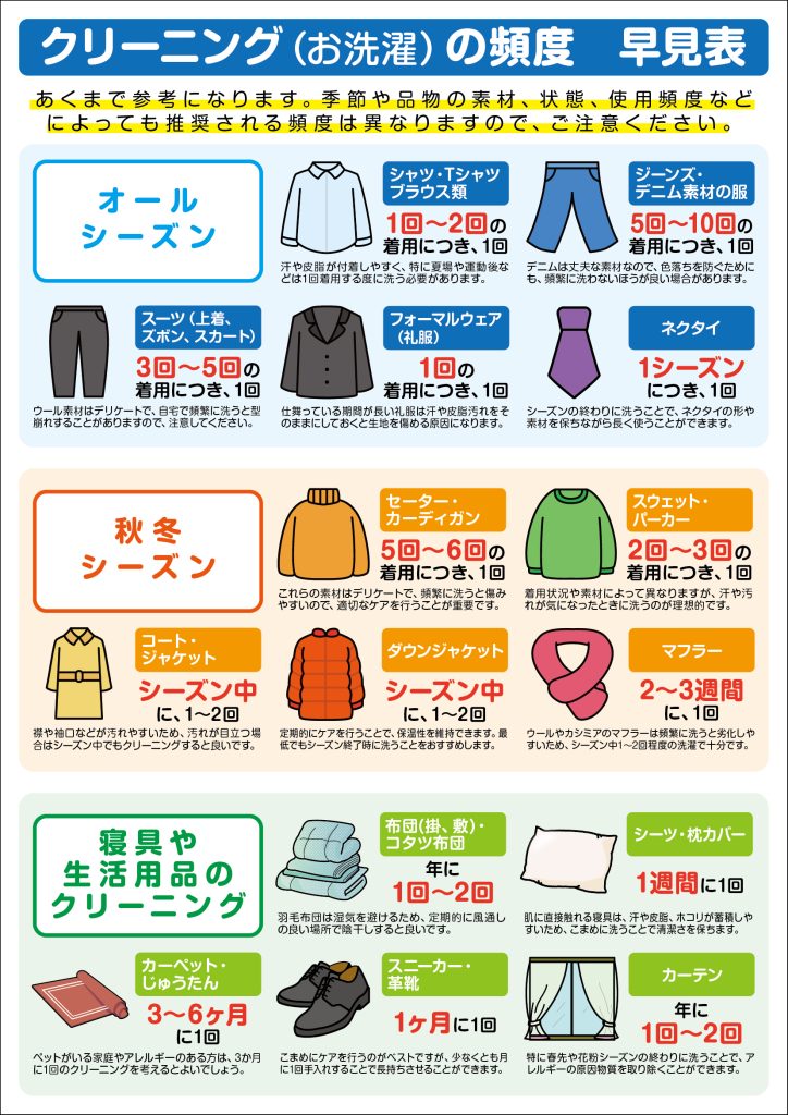 お洋服をどの程度着てからクリーニングに持っていけばいいの?という疑問に答えるために、クリーニング早見表をお作りいたしました!ご参考いただければと思います。
