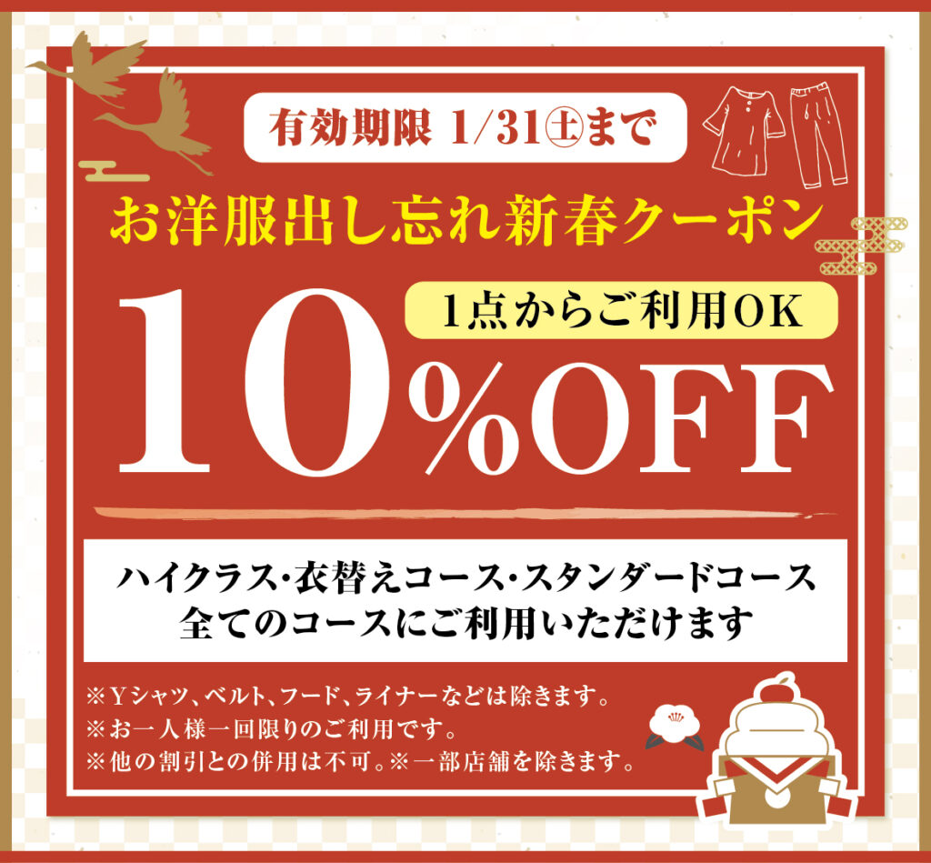 日頃ご愛顧いただいている皆様へ、1/31(土)までご利用いただける「お洋服出し忘れ10%OFF新種クーポン」をプレゼント!