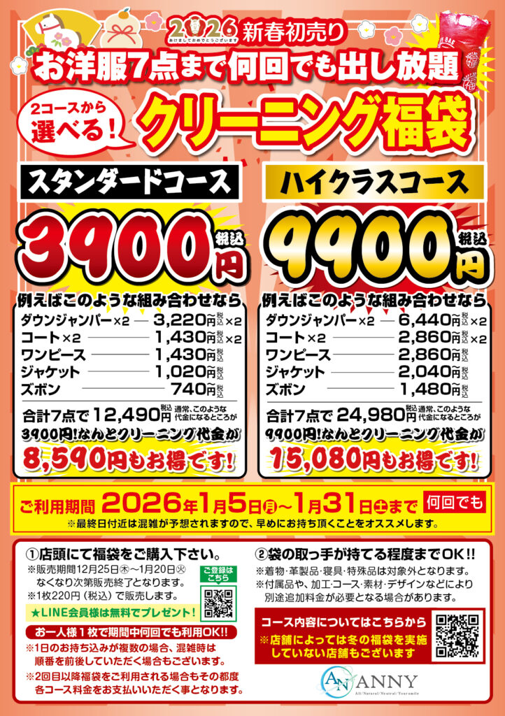 大切な振袖や着物を長く美しく保つためにも、クリーニングでお手入れをしてから仕舞ってくださいね。 - お洋服出し忘れ新春クーポン